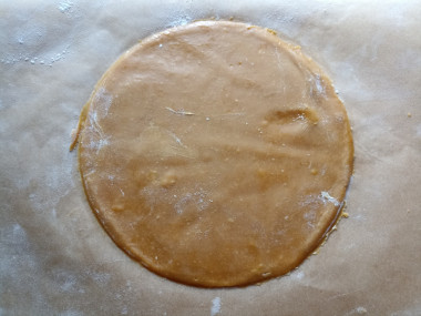 Каждую часть раскатайте на силиконизированном качественном пергаменте тонкий пласт. Вырежьте из теста ровный круг. Обрезки оставьте вместе с коржом. Правильно выбрать пергаментную бумагу вы сможете, прочитав информацию о видах пергамента в конце рецепта.