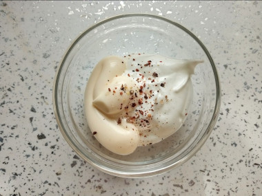 В отдельной небольшой мисочке соединяем вместе сметану и майонез, хорошенько мешаем. Пробуем на вкус, добавляем при необходимости соль и по желанию черный молотый перец. Идеально, если он будет свежемолотым.