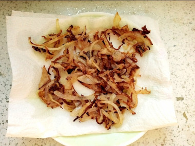 На сковородку наливаем растительное масло, ставим ее на средний огонь и хорошо разогреваем. Когда это произойдет, выкладываем в раскаленное масло нарезанный лук. Обжариваем его, время от времени помешивая, до красивого золотистого цвета и мягкости. Выкладываем обжаренный лук на слой из бумажных полотенец, чтобы впиталось лишнее масло.