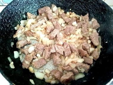 В глубокой сковороде разогрейте растительное масло. Помешивая, обжарьте мясо на сильном огне до появления золотистой корочки. О том, как выбрать сковороду и идеальное для жарки масло читайте в отдельных статьях, ссылки под шагами.