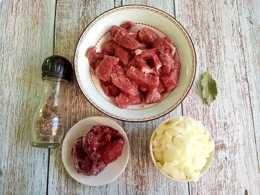 Как сделать гуляш из говядины с подливкой классический на сковороде? Подготовьте ингредиенты. Для гуляша из говядины с подливкой нам понадобится: мякоть говядины, луковица, томатная паста или томатный соус (по желанию), вода, мука, лавровый лист, черный молотый перец, соль.