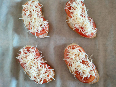 Уложите кружочки помидора на куски хлеба. По вкусу вы можете посолить и поперчить их. Сверху посыпьте помидоры натертым сыром. Как вариант, вы можете не натирать сыр, а нарезать его тонкими пластинками и уложить их.