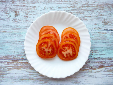 Помидор помойте, обсушите и нарежьте тонкими кружочками.