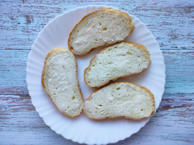 Кусочки хлеба натрите разрезанным зубчиком чеснока (если вы его любитель, то можете также нарезать зубчики пластинками и уложить на помидор). Намажьте хлеб небольшим количеством сливочного масла. Это будет удобнее сделать, если масло будет мягким — тогда слой получится минимальным.
