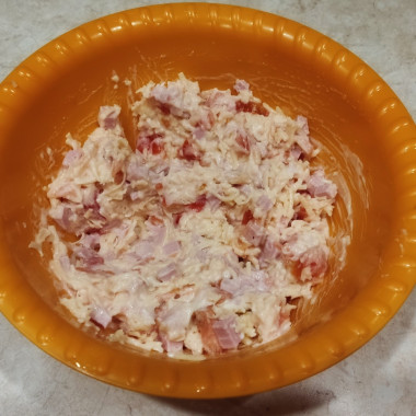 Смешала с майонезом. Батон нарезала на ломтики,которые немного смазала кетчупом. Сверху выложила начинку. Запекала в духовке при 200° 15 минут. Быстро, просто и очень вкусно 👍