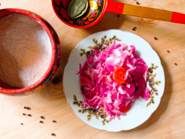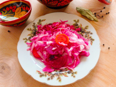 Отличная закуска получилась по этому рецепту. У неё пряный вкус и аромат. Капуста получилась хрустящая, свекольные и морковные кусочки стали достаточно мягкими, чтобы есть их без труда. Маринованная капуста со свёклой и чесноком быстрая хороша как сама по себе, так и в качестве дополнения к супу или ко вторым блюдам.