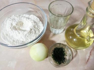 Как сделать лепешки с луком на сковороде? Подготовьте продукты. Муки дано примерное количество, ее надо будет подсыпать во время замеса и потом, при раскатке. Масло используйте рафинированное, без запаха. Воду — фильтрованную или бутилированную.