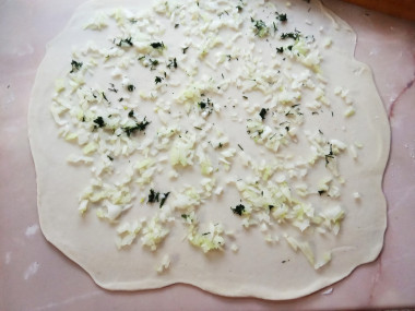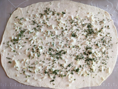 Вылежавшееся тесто раскатайте на столе, присыпанном мукой, в тонкий прямоугольный пласт.