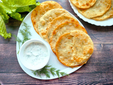 . Из зелени взяла укроп. Из указанного количества ингредиентов у меня получилось 12 лепешек диаметром около 10 см. Подавала к столу с пылу с жару, со сметанным соусом. Лепешки готовить быстро и просто, а получаются они очень питательными, хрустящими, с насыщенным вкусом обжаренного лука