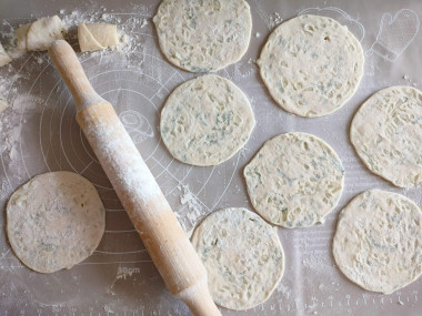 Возьмите заготовку и поставьте ее вертикально (срезом вверх) на доску, припыленную мукой. Раскатайте шайбу в лепешку толщиной около 3мм. Сделайте подобным образом лепешки из всех заготовок.