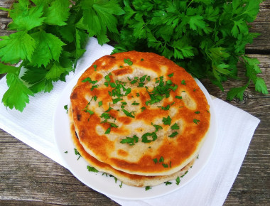 Захотелось лепешек на перекус приготовить. Жареный лук я очень люблю) Когда его жарила посыпала не только солью, но и сахаром. Так лук быстрее жарится и становится карамельным. Тесто, хоть и пресное, очень приятно вымешивать, в конце оно становится эластичным и мягким. Раскатывается оно тоже легко, получается тонкая лепешка. После приготовления первой лепешки сделала вывод, что скатывать блинчик в рулет надо не плотно, чтобы потом можно было потоньше раскатать. Чем тоньше раскатана "улитка", тем лучше прожарится лепешка внутри. Жарила на растительном масле под крышкой на маленьком огне. Получились вкусные, румяные лепешки. Удобно взять в дорогу или на пикник на перекус.
