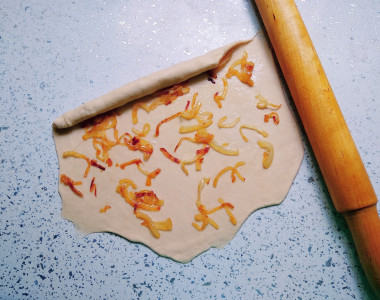 Готовое тесто разделите на 4 равные части и скатайте каждую часть в шарики. Возьмите первый шарик теста и раскатайте его в очень тонкую круглую лепешку. Выложите остывшую луковую начинку на лепешку и распределите ее по всей поверхности.