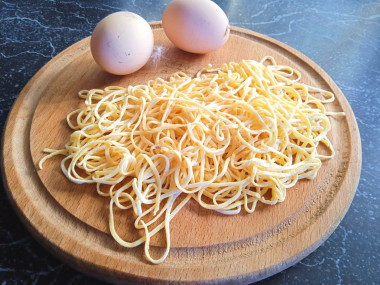 Из теста скатайте плотный круглый шар, оберните пищевой пленкой и уберите на полчаса в холодильник. Через указанное время тесто выньте из холодильника. На припыленном мукой столе раскатайте тесто в тонкий пласт и разрежьте его на узкие длинные или короткие полосочки в зависимости от того, какой длины домашнюю лапшу вы хотите приготовить.