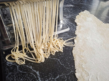 Приготовила тесто для домашней лапши по этому рецепту. Всё очень легко и просто. Яйца брала домашние, чтоб лапша была желтенькая. Взбила вилочкой яйца с солью. Добавила просеянную муку, воду и масло. Замесила эластичное тесто. Дальше я использовала машинку для раскатки теста. Очень тонко раскатала. Нарезала с помощью машинки для нарезки лапши. Решила сделать узкую и длинную лапшу. Оставила подсохнуть, на хранение не оставляла и сразу сварила суп с домашней лапшой. Рецепт прекрасный! Лапша получилась вкусная и нежная. При варке не слипалась. Домашняя лапша - очень бюджетный вариант. Из данного количества продуктов у меня получилось 320 грамм лапши. Большое спасибо автору!