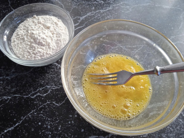 В отдельную емкость вбейте куриное яйцо, добавьте соль и взбейте всё вилкой или венчиком, чтобы яйцо разошлось, а соль растворилась.