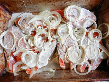 У меня была большая тушка кеты. Половину (примерно 800 граммов) я приготовила, основываясь на рецепт горбуши в сметане, запеченной в духовке.