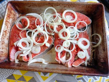 Тем временем очистите лук от шелухи и нарежьте его полукольцами. Нарезанный лук равномерно выложите поверх рыбы. Если тушка большая, то количество лука можно увеличить.