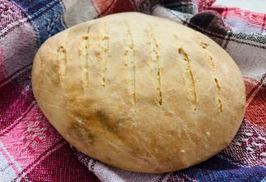 Сделайте поверх теста неглубокие надрезы и присыпьте поверхность хлеба мукой. Выпекайте около 20 минут при 220°С. Затем уменьшите температуру до 200°С и выпекайте хлеб еще примерно 30 минут. Точное время и температуру запекания определяйте по своей духовке.