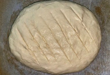 Из теста сформируйте буханку и переложите ее на застеленный пергаментом противень или в форму для выпечки.