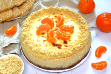Жаль только, что в рецепте не указан диаметр самого чизкейка. Но… Спасибо отзыву ♔[SladkaЯ]♔, так как из него следует, что форма в 24 см. для чизкейка слишком большая, в ней творожный десерт получается плоским. Поэтому я использовала раздвижную форму кольца, установив диметр кольца 19 см. Что у меня вышло, можете увидеть на фото. Украшала чизкейк дольками мандарина и крошкой печенья, которое использовалось и в основе чизкейка.