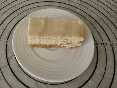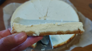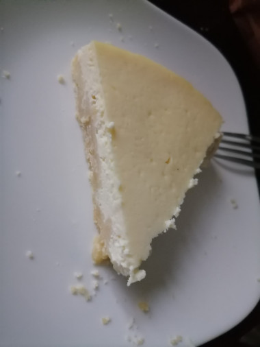 Как же я благодарна Марии за столь чудесный рецепт! У меня формочка 24 см диаметром, поэтому чизкейк получился плоским, но даже такой маленький кусочек (как на фото) очень сытный.