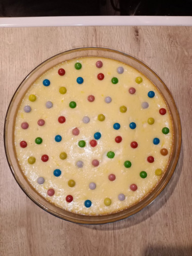 В этот раз не заморачивалась с украшением. Делала для перекуса). Форму всегда использую стеклянную.