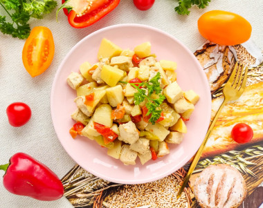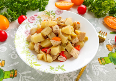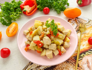 Нашла рецепт тушеной картошки с индейкой. У меня была куриная грудка. Почему бы и не попробовать. Тем более не совсем привычный способ, я впервые обжаривала картофель перед соединением с мясом. Проделала все манипуляции: почистила, накрошила, обжарила и оставила на плите на час. Картошка получилась мягкой, но не развалилась. Очень вппетитно выглядела при подаче. Огромная благодарность автору рецепта) и не только за рецепт)