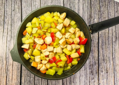 Верните в сковороду индейку. Влейте немного горячей воды так, чтобы она дошла до середины продуктов. Убавьте огонь до минимального, накройте сковороду крышкой и оставьте блюдо тушиться примерно на 1 час.