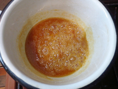 На медленном огне растопите сахар до светло-коричневого цвета. Сахар будет шипеть и булькать, поэтому будьте осторожны.