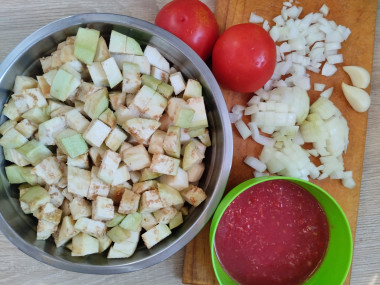 Подготовьте остальные овощи. Помидоры помойте, удалите плодоножку и нарежьте подобно баклажанам - кубиками. Лук очистите от шелухи и нарежьте кубиками. Чеснок очистите и мелко нарежьте или пропустите через пресс. Но мне именно в этом рецепте понравился чеснок более крупного размера. Для нарезки чеснока я использовала деревянную лопаточку - на ней это делать очень удобно.