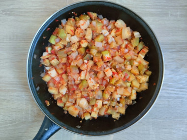 Возьмите сковороду, налейте на нее растительное масло и хорошо его разогрейте на плите. Выложите на сковороду баклажаны, помидоры и лук. Перемешайте овощи и жарьте на сильном огне 5 минут при помешивании. Как выбрать сковороду и масло для жарки читайте в отдельных статьях в конце этого рецепта.