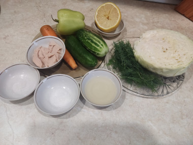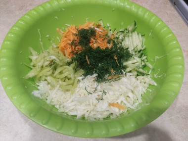 Капусту нашинковала, огурец и перец порезала соломкой, морковь натерла на крупной тёрке, зелень укропа измельчила. Соединила все ингредиенты,добавила икру минтая,несколько капель лимонного сока, немного майонеза и перемешала.