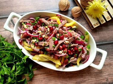 Для салата я отваривала кусочек говядины в течение двух часов. Затем переложила в контейнер, накрыла крышкой и остудила. Таким образом мясо не заветрилось. Болгарский перец у меня был только жёлтый, но он тоже яркий и сочный) Лук взяла красный, как и рекомендуется, я тоже его люблю. Пока нарезала все остальное, лук мариновался в яблочным уксусе. Фасоль мне захотелось взять консервированную. Мне кажется, она вкуснее и мягче. Да и приготовление салата занимает меньше времени. Грецкие орехи тоже обжарила, так они вкуснее. Для того, чтобы было легче их порубить, сначала придавила плоской стороной ножа к доске, а потом уже резала. По рекомендации автора добавила в салат зерна граната. Получился очень яркий и вкусный салат! В нём сочетаются сочные, хрустящие овощи и сытные белковые компоненты. Отличный, сбалансированный состав. В нём нет майонеза, зато есть приятная кисленькая заправка и полезное масло (у меня оливковое). Советую приготовить этот замечательный салат и порадовать близких!