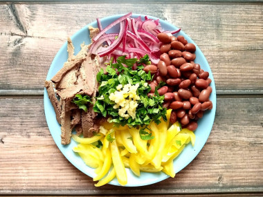 Салат просто бесподобный! Не думала, что из такого простого набора продуктов можно приготовить настоящий кулинарный шедевр. Говядины у меня дома не нашлось, но был кусок домашней запеченной свиной лопатки. Лук использовала обычный репчатый, фасоль красную консервированную. Когда мариновала лук в уксусе, добавила в него немного соли и сахара для более насыщенного вкуса. Заправила оливковым маслом. Уверена, что этот салат станет частым гостем на моем столе, потому что он не только невероятно вкусный, но и чрезвычайно насыщен белком, что делает его очень полезным. Спасибо за рецепт!