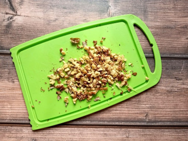 Грецкие орехи обжарьте на сухой сковороде, это сделает их более ароматными и хрустящими. Затем порубите орехи ножом.