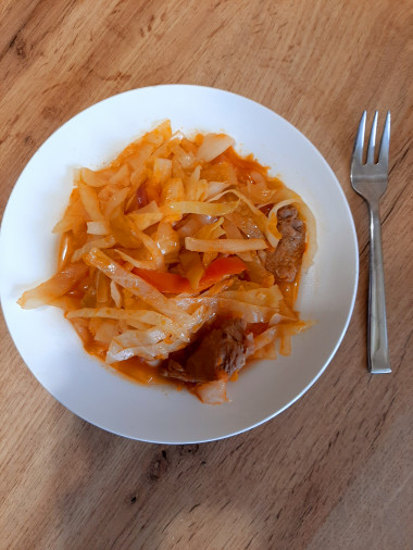 Вкусно, спасибо за рецепт! Не доверилась и добавила снова с капустой воду, и зря)) вы молодец, хоть и нет пошаговых фото, но все понятно,легко, а главное в результате вкусно! Кстати, томатной пасты у меня не было, добавила лечо, не знаю как пастой, но так прям ароматно! Как говорят, пальчики оближешь!)) Спасибо!