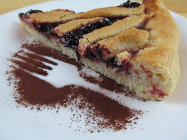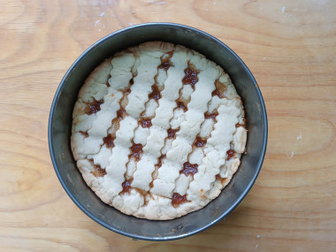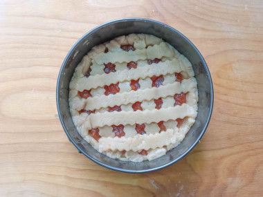 Вторую, меньшую половину теста, раскатайте также в пласт, но прямоугольный, шириной примерно как ваша форма. Нарежьте его на полоски толщиной около 1см. Выложите полоски сверху на пирог, имитируя решетку. Края прижмите к бортикам. Из остатков теста можете скрутить веревочки и разложить их по краю пирога.
