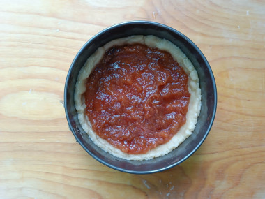 Разделите тесто на две части — одну большую, другую поменьше. Выложите более крупный кусок на лист пергамента. Раскатайте его в тонкий круглый пласт толщиной около 5мм. При помощи скалки перенесите тесто в форму для выпечки. С выбором формы поможет статья по ссылке в конце рецепта.