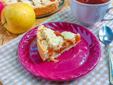 Выпекала пирог при 180 градусах 40 минут. Получился он очень вкусный. Тесто песочное, мягкое и в то же время хрустящее, в меру сладкое. При нарезании пирог не крошится. К стенкам формы не прилип.