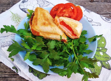Выложить сэндвичи на панель, закрыть крышкой, прижать и включить нагрев. Дождаться сигнала о готовности, открыть крышку и осторожно достать сэндвичи на тарелку. Для приготовления таких сэндвичей в микроволновой или духовой печах готовность смотреть по расплавленному сыру.