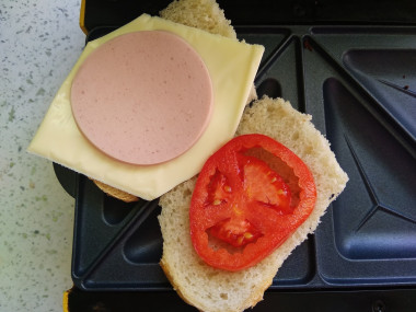 На кусочек хлеба положить кружок помидора, сыр, колбасу. Если готовится сэндвич в микроволновке, то последним лучше оставить сыр. Я готовлю в электросэндвичнице, поэтому накрываю сэндвич ещё одним кусочком хлеба. Если покажется, что сэндвичи суховаты (хотя вряд ли), можно смазать хлеб майонезом или маслом.