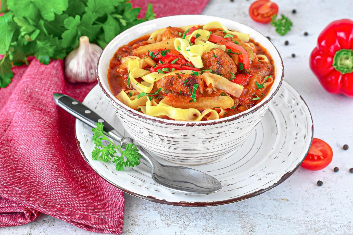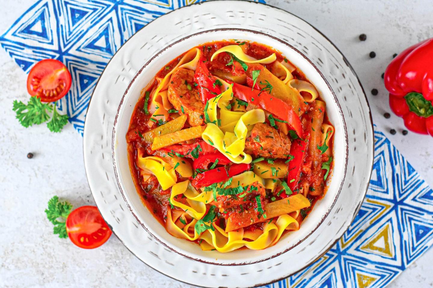 По моему мнению, этот лагман из свинины готовится по классическому рецепту. И в нем можно изменять одно мясо на другое. Свинина, мне кажется, получается лучше всего - она сочная, мягкая, нежная, очень вкусная. По сути, это то же самое рагу, но с добавлением лапши. Домашней у меня не было и возиться с ней не хотелось, поэтому я брала обычную магазинную.