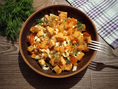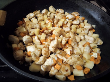 Затем в сковороду кладем овощи. Сначала морковь, перемешиваем, обжариваем около 10 минут. Затем кладем картофель, перемешиваем. Добавляем специи: соль и черный молотый перец по вкусу. Вливаем небольшое количество воды. Тушим под крышкой около 15 минут. Затем добавляем оставшиеся овощи. Перемешиваем, тушим все вместе еще 15 минут под крышкой.