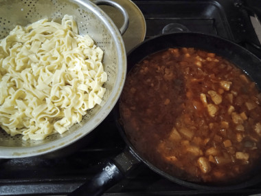 Вынимаем лапшу шумовкой из воды и отправляем на сковороду к мясу с овощами. Перемешиваем и тушим еще около 7 минут. Посыпаем рубленной зеленью. Выключаем огонь, оставляем под крышкой на 10 минут.