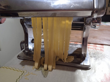 Тем временем приготовим и отварим домашнюю лапшу. Тесто на присыпанном мукой столе раскатываем в тонкий пласт и нарезаем соломкой, длинной или короткой.