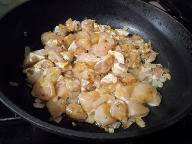 Отправляем на сковороду к репчатому луку приготовленное куриное мясо.
