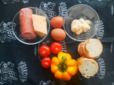 Я использовала французский багет. Перец у меня был жёлтый, помидоры черри, а колбаса была полукопчёная.