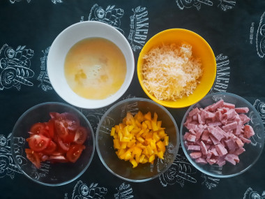 Первым делом я нарезала достаточно мелко колбасу, перец и помидоры, сыр натёрла на тёрке. Яйца взбивала вилкой. Обмакнув хлеб в яйца, я поджарила его на сливочном масле. Первым слоем на хлеб выложила помидоры и перец, потом колбасу, затем посыпала сыром и отправила микроволновку. По вкусу получилось как пицца!