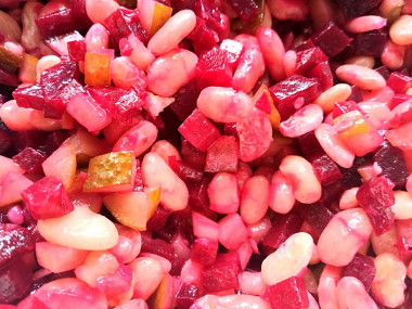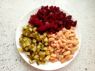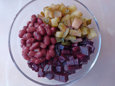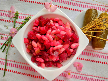 Салат со свеклой и фасолью без майонеза по этому рецепту получился вкусным, сочным и сытным. Свеклу варила примерно полтора часа, затем охладила под струёй холодной воды. После этого свекла не только быстро доходит до готовности, но и легко чистится. Фасоль решила отварить, у меня была белая. Кстати, с консервированной фасолью салат будет нежнее. А огурчики взяла из своих летних заготовок, эта партия была остренькой) Получился очень яркий и красивый салат! А главное, он постный и отлично разнообразил меню. Сухариков у меня не было. Думаю, с ними было бы ещё вкуснее! Спасибо за рецепт вкусного салата)
