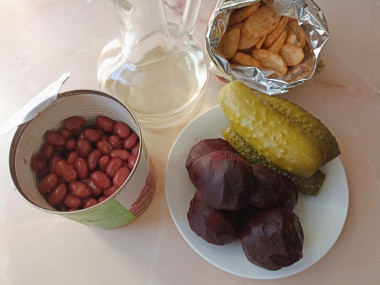 Как сделать салат со свеклой и фасолью без майонеза? Подготовьте ингредиенты. Свеклу предварительно отварите и остудите. Свеклу для салата можно использовать как вареную, так и запеченную в духовке в фольге. Фасоль возьмите красную, без каких-либо добавок. Сухарики вы можете приготовить самостоятельно или купить готовые.
